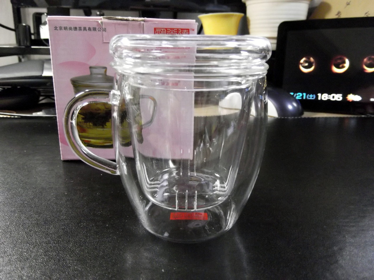 これは、耐熱ガラス製の、茶漉しつきマグカップ。